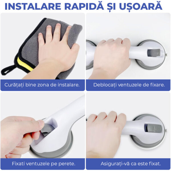 Atenție: Înainte de fiecare utilizare, asigurați-vă că mânerul este fixat ferm pe suprafața dorită pentru a evita orice accident sau alunecare. Verificați prinderea ventuzelor pentru a vă asigura că acestea sunt bine lipite!